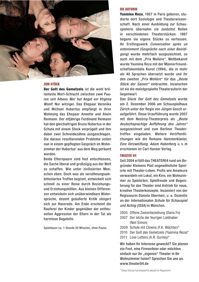 Der Gott des Gemetzels 2006 im Schauspielhaus Zürich uraufgeführt spielt auf der Grenze zwischen Gesellschaftssatire und menschlichem Desaster. Gott des Gemetzels verhandelt wird vertraut gemacht werden. Als sich die Eltern treffen um den Fall zu klären ist die Eskalation.